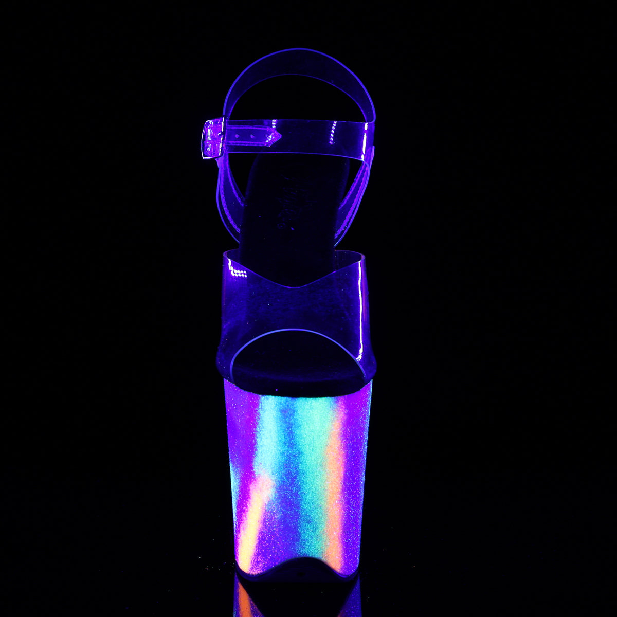 Additional Description 8"" (200mm) Heel, 4"" (100mm) Platform Ankle Strap Sandal Featuring Blacklight Reactive Galaxy Effect Platform Bottom