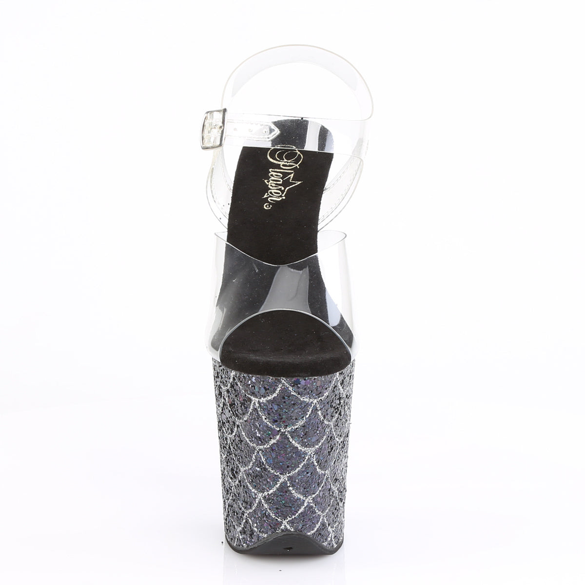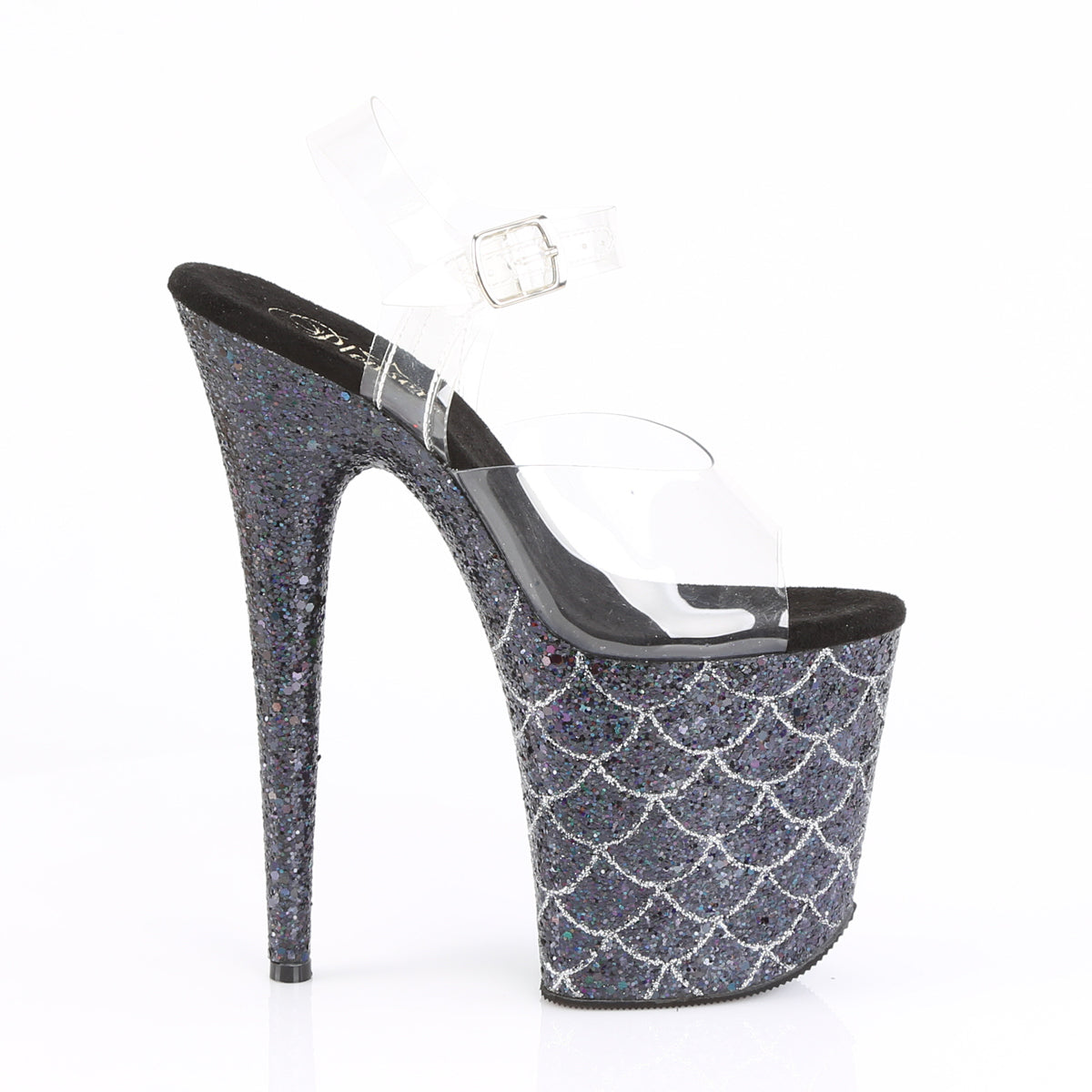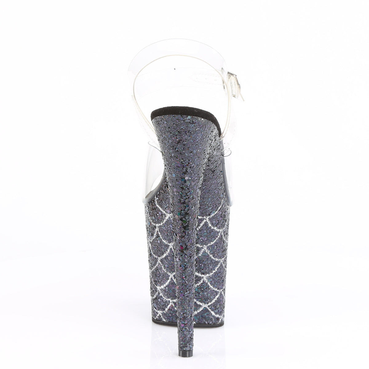 Additional Description 8"" (203mm) Heel, 4"" (102mm) Platform Ankle Strap Sandal Featuring Holographic Glitter Mermaid Scales Design on the Platforms