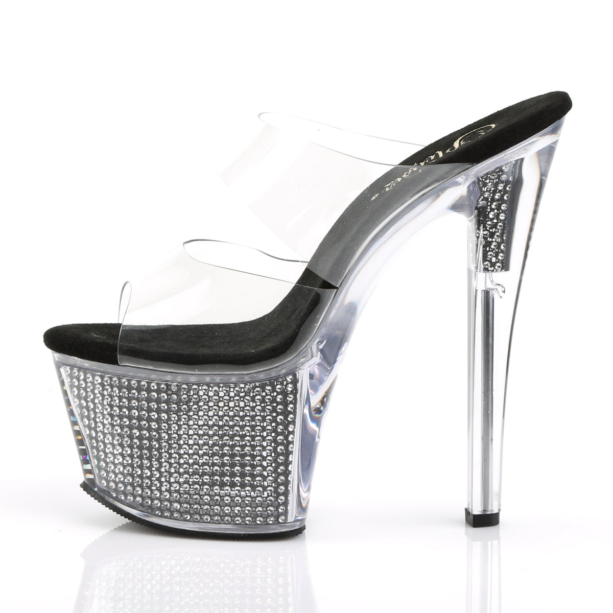 Additional Description 7"" (17.8cm) Heel, 2 3/4"" (7cm) Platform Two Band Slide Featuring Chrome Plated, Simulated Rhinestone Filled Platform