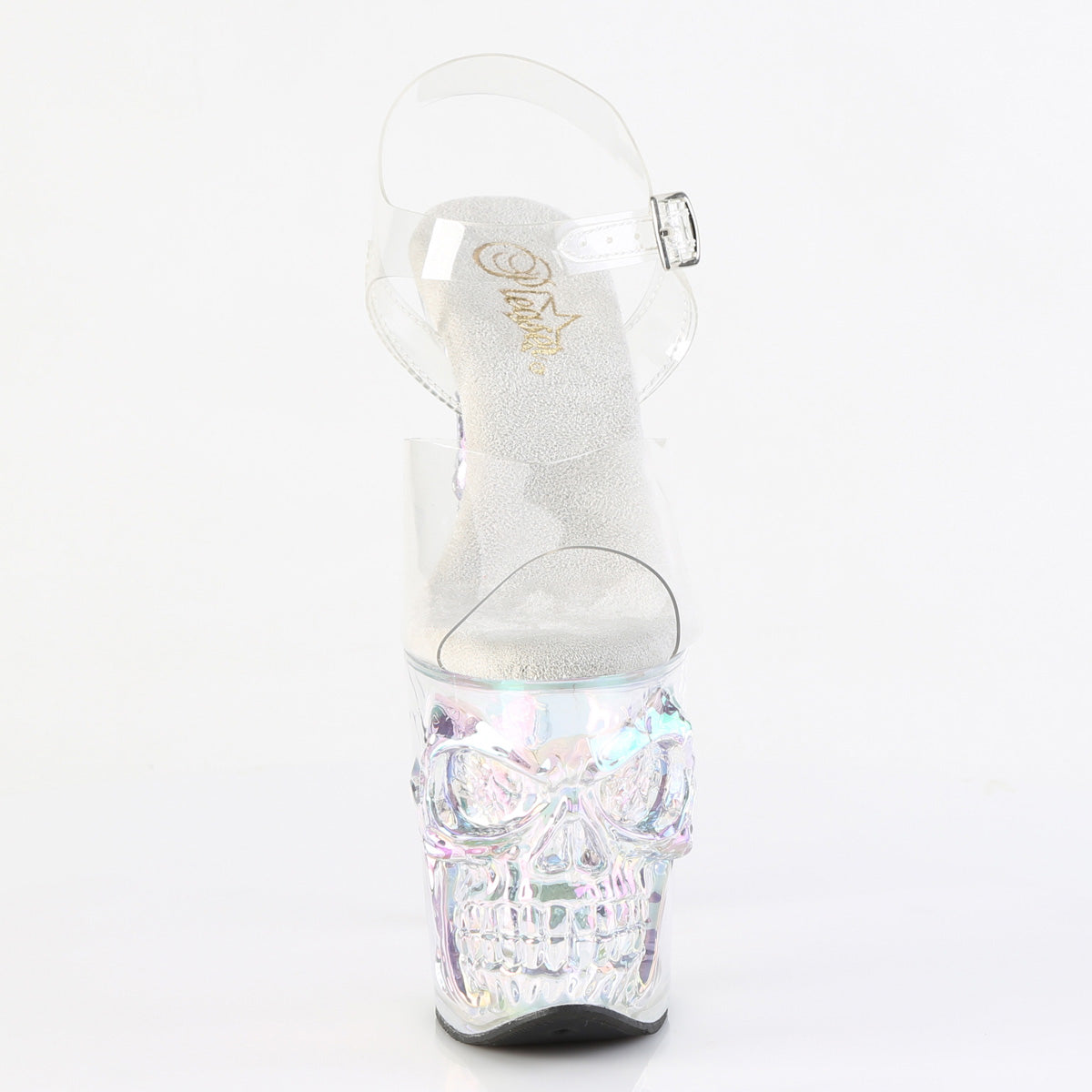 Additional Description 8"" (200mm) Finger Bone Heel, 4"" (100mm) Platform Ankle Strap Sandal Featuring Holographic Tinted Skull & Bones Platform Bottom